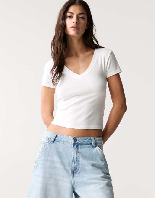 Pull&Bear - T-shirt col V - Blanc