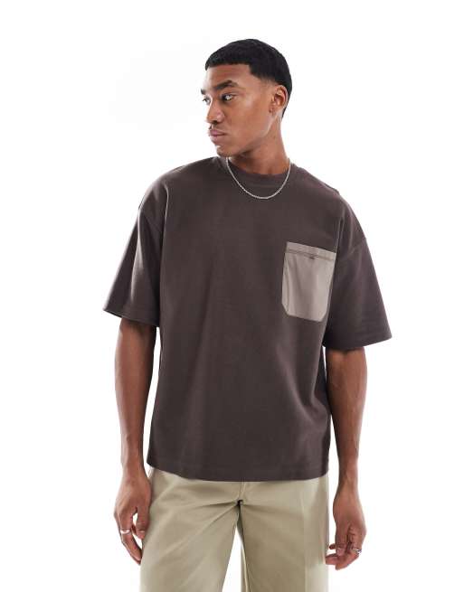 Pull&Bear - T-shirt coupe carrée avec poche contrastante - Marron