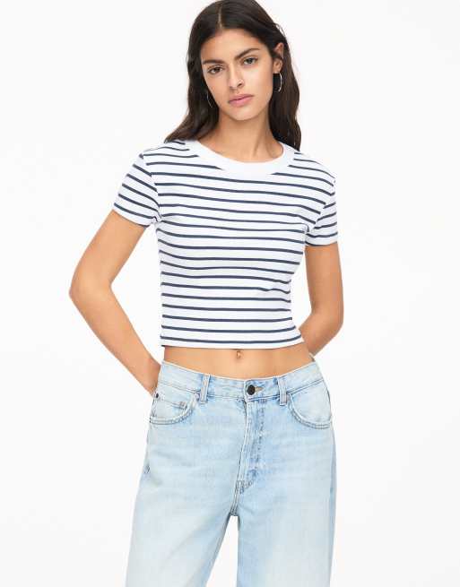 Pull&Bear - T-shirt crop top côtelé à rayures