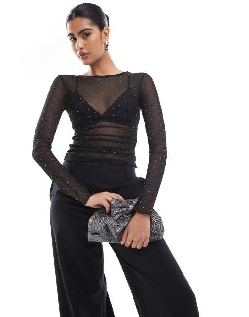 Pull&Bear - Top en tulle à manches longues à clous - Noir pailleté