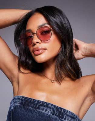 Quay - Big Time - Lunettes de soleil rondes en métal à verres roses - Doré