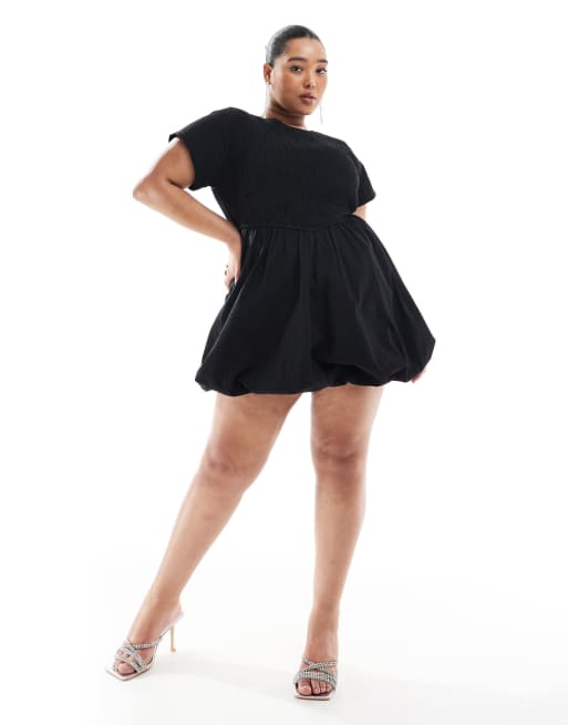 Exclusivité - Renée Studio Plus - Robe courte froncée en popeline à manches courtes et ourlet boule - Noir