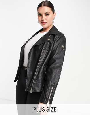 River Island Plus - Blouson style motard en similicuir griffé - Noir