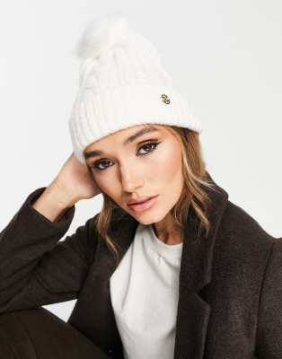 River Island - Bonnet en maille torsadée à pompon - Crème