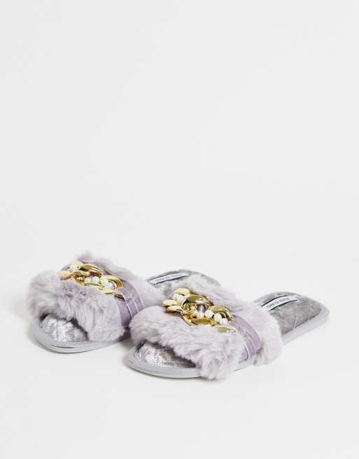 River Island - Chaussons en fausse fourrure à détail chaîne et perles - Gris
