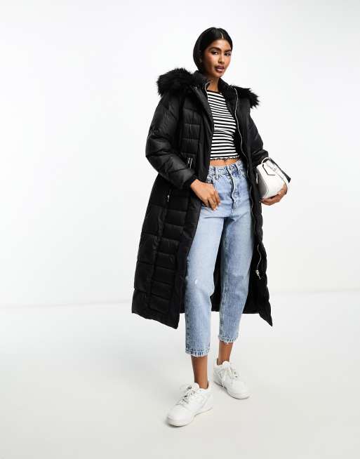 River Island - Doudoune longue avec ceinture et capuche avec fausse fourrure - Noir
