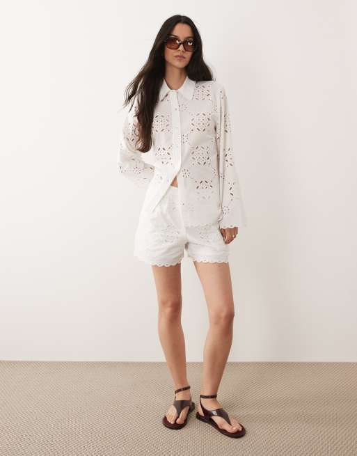 River Island - Ensemble chemise et short en popeline ajourée - Blanc