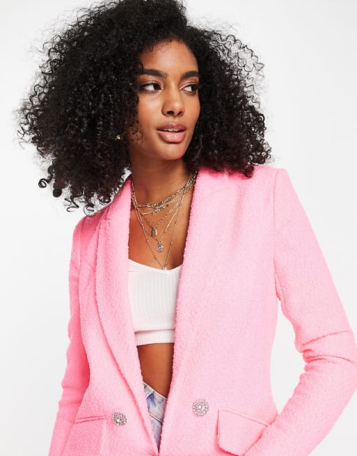 River Island - Ensemble en bouclé avec veste boutonnée et mini-jupe à ourlet arrondi - Rose vif
