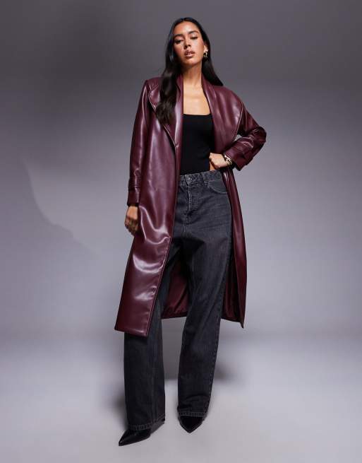 River Island - Manteau croisé long en similicuir - Rouge foncé