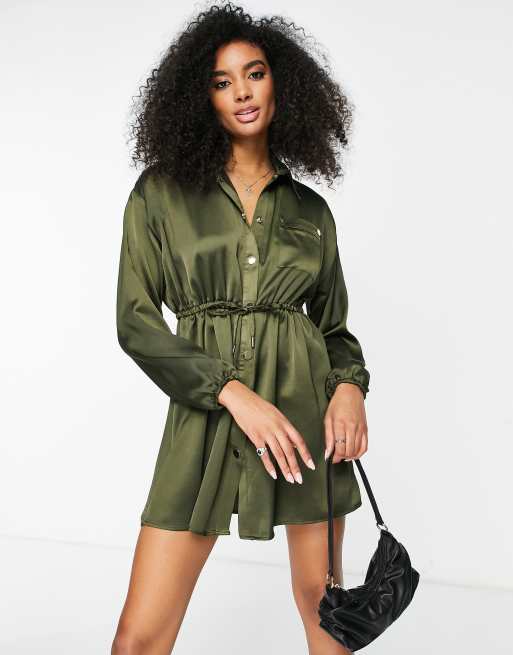 River Island - Robe chemise fonctionnelle courte en satin - Kaki