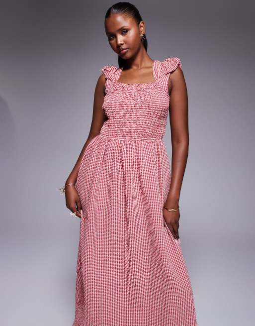 River Island - Robe mi-longue froncée à carreau vichy avec mancherons - Rouge