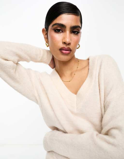 Selected Femme - Pull en maille à col V - Crème