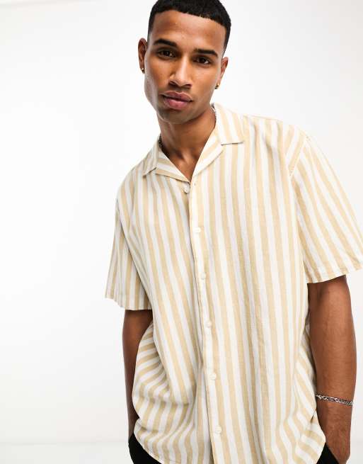 Selected Homme - Chemise manches courtes en lin rayé avec col à revers - Beige/blanc