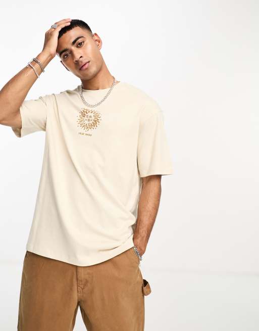 Selected Homme - T-shirt oversize à imprimé soleil sur la poitrine - Beige