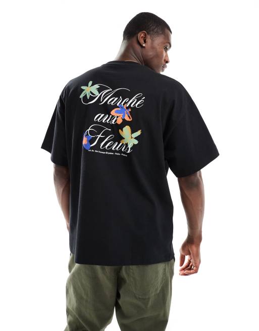 Selected Homme - T-shirt oversize épais à imprimé fleurs au dos - Noir