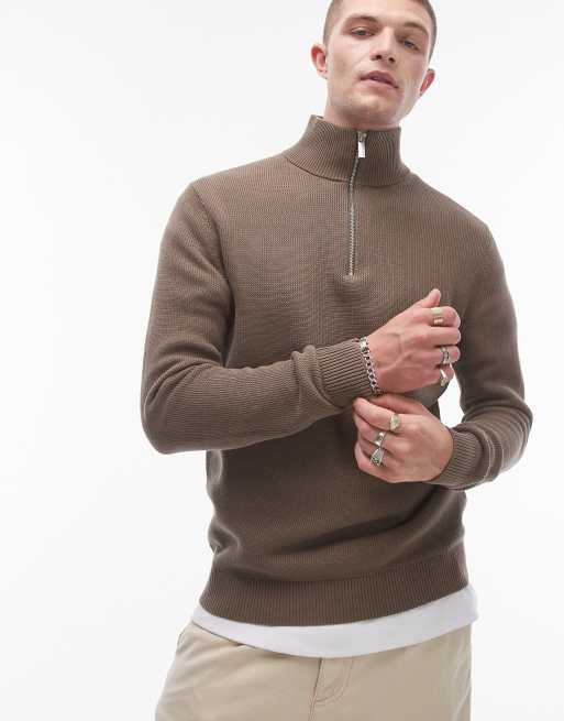 Selected - Pull en maille 100 % coton à demi fermeture éclair - Fauve