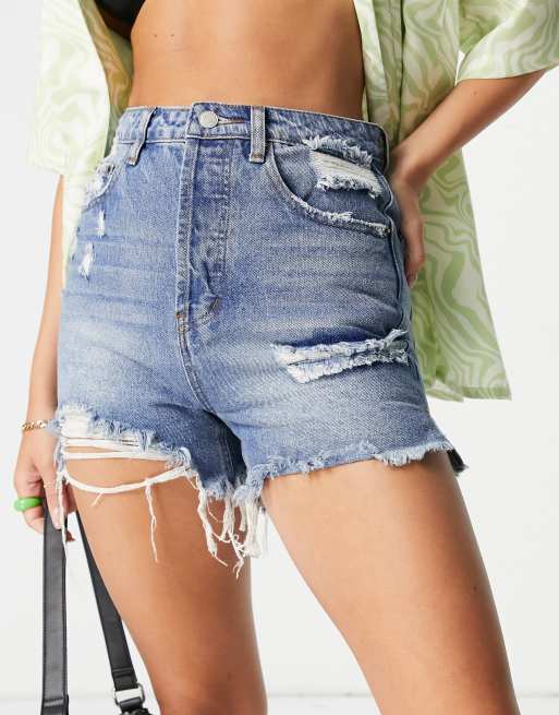 Signature 8 - Short en jean à taille haute et déchirures - Délavage moyen