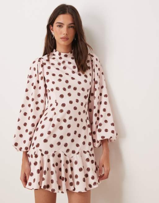 Exclusivité - Sister Jane -Robe courte à pois et col montant avec manches ballon et ourlet plongeant volanté - Rose