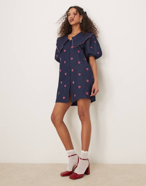 Sister Jane - Robe courte en denim avec cœurs brodés - Bleu