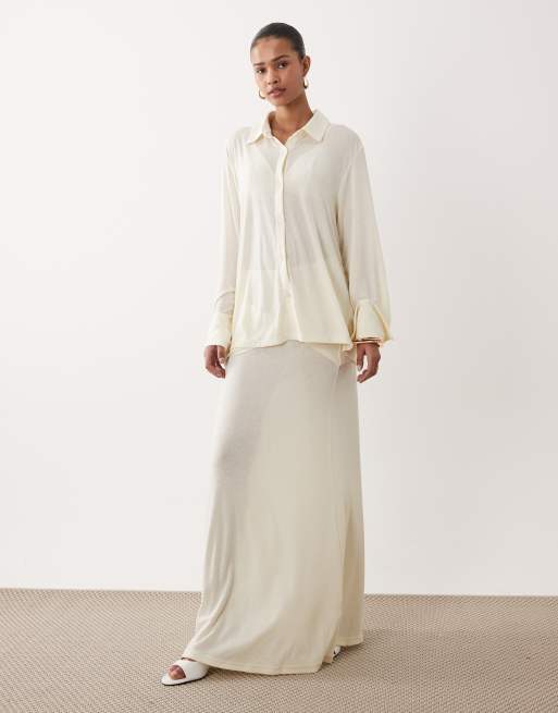 SNDYS - Ensemble avec chemise semi-transparente en maille fine et douce et torsadée devant et jupe longue - Blanc cassé