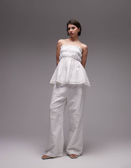 SNDYS - Ensemble avec top bustier froncé et pantalon large en lin mélangé avec fleurs appliquées - Blanc