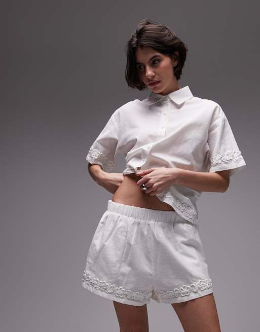 SNDYS - Ensemble chemise à manches courtes et short en lin mélangé avec fleurs appliquées - Blanc
