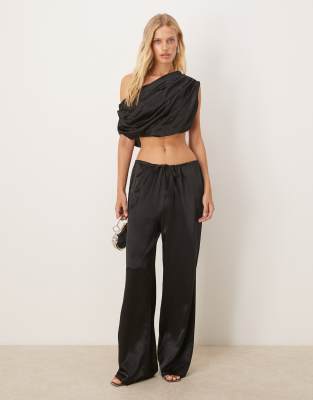 SNDYS - Ensemble top drapé asymétrique et froncé avec pantalon large en satin - Noir