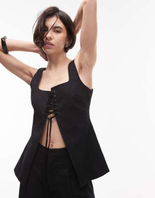 SNDYS - Top d'ensemble fendu devant en lin mélangé avec encolure carrée et détail lacé - Noir