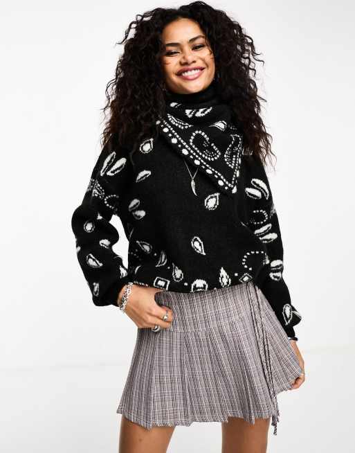 Something New X Emma Fridsell - Ensemble 2 pièces avec pull en maille et bandana motif cachemire - Noir et blanc
