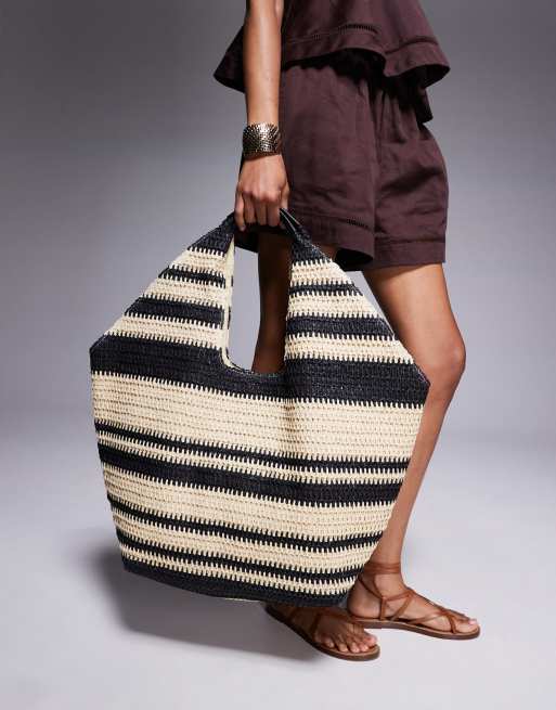 South Beach - Cabas en paille à motif graphique oversize - Noir à rayures