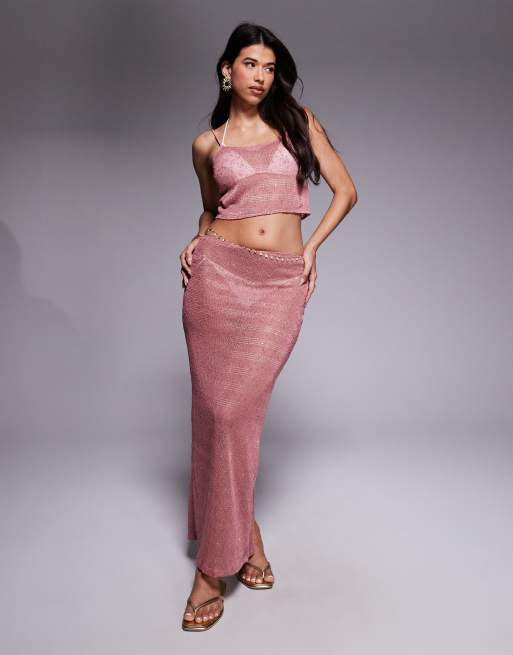 South Beach - Jupe longue en maille ornée de sequins - Vieux rose