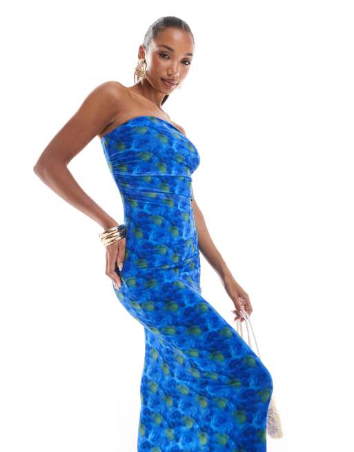 South Beach - Robe bandeau longue en tulle à imprimé fleuri abstrait - Bleu