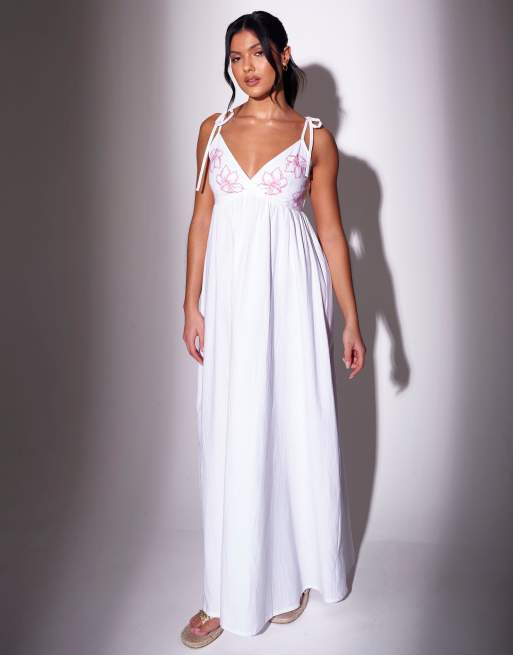 South Beach - Robe longue à bretelles nouées et fleurs brodées - Blanc