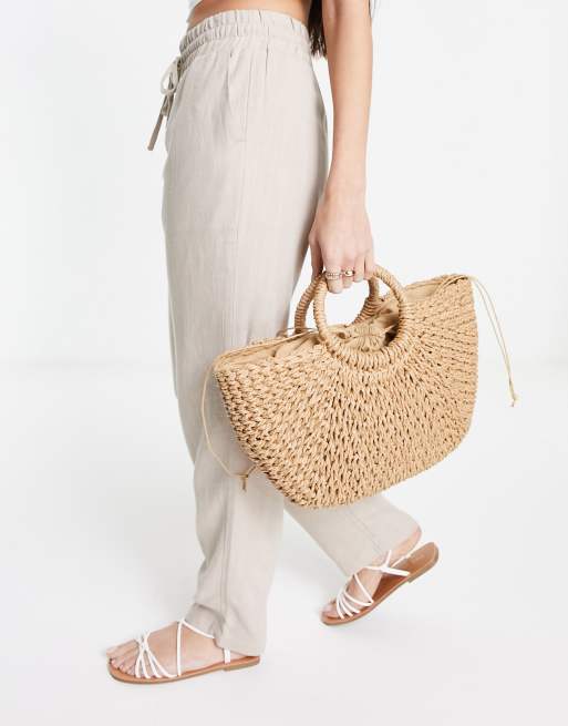 South Beach - Sac à main de plage en paille avec poignée ronde - Beige