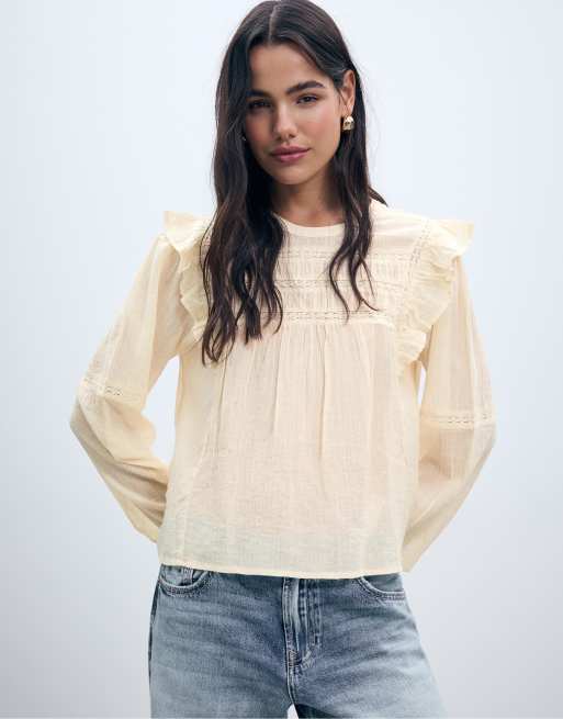 Stradivarius - Blouse à volants et bords en dentelle - Vanille