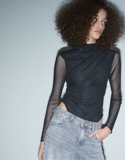 Stradivarius - Body froncé en tulle orné de strass - Noir