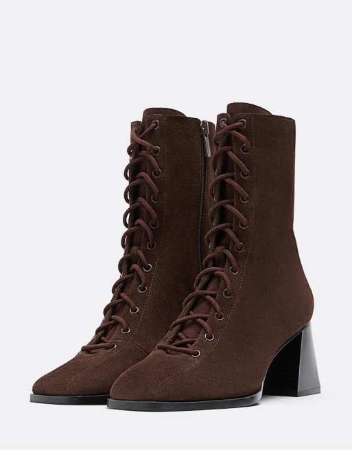 Stradivarius - Bottines en cuir à laçage et talon haut - Marron