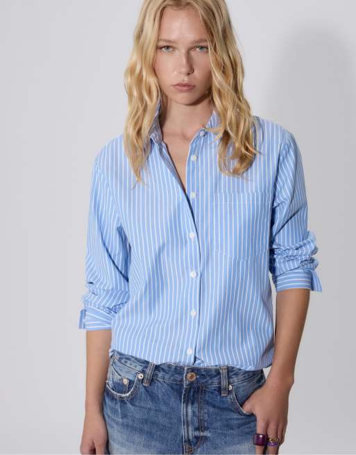 Stradivarius - Chemise basique en popeline à rayures avec poche - Bleu denim
