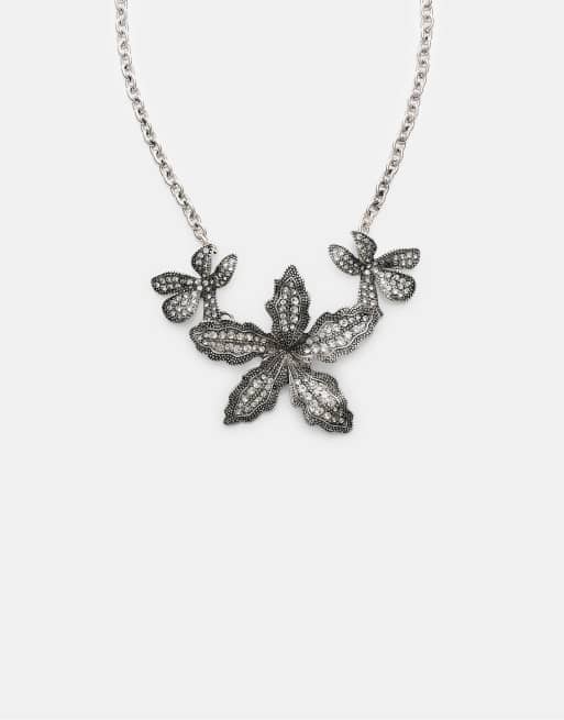 Stradivarius - Collier à strass avec détail fleur - Gris