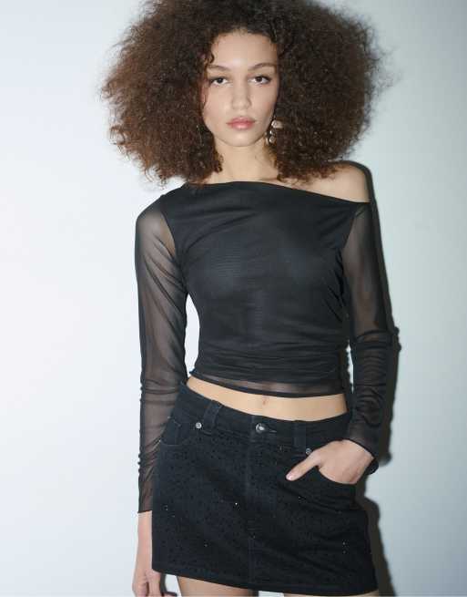 Stradivarius - D62 - Jupe-short en jean ornée de strass - Noir délavé