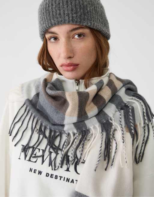 Stradivarius - Écharpe à carreaux avec franges- Noir