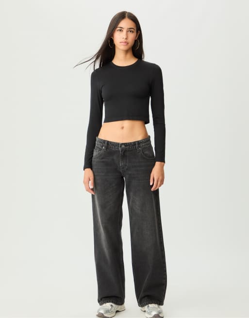 Stradivarius - Jean baggy à taille mi-haute - Noir denim délavé