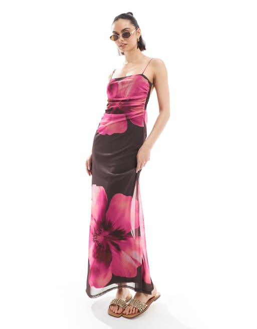 Stradivarius - Robe longue en tulle à fleurs - Rose et marron