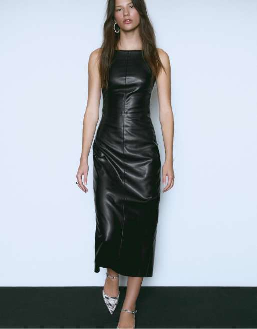 Stradivarius - Robe mi-longue en similicuir - Noir