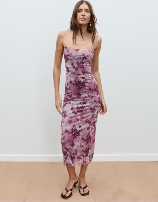 Stradivarius - Robe mi-longue imprimée en tulle - Rose