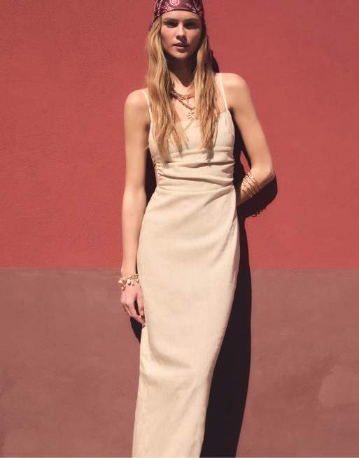 Stradivarius - Robe mi-longue ouverte dans le dos en lin mélangé - Taupe