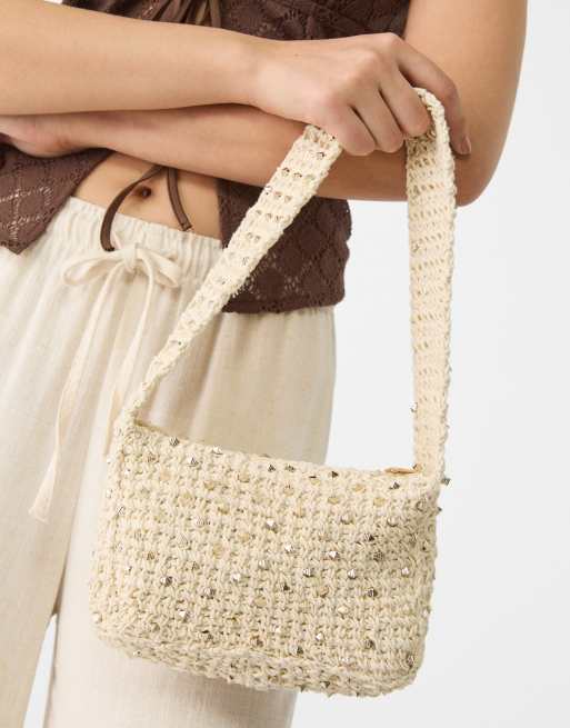 Stradivarius - Sac porté épaule en maille crochetée orné de perles - Écru