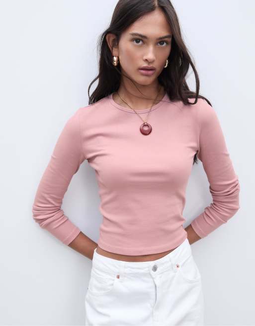 Stradivarius - T-shirt à manches longues basique en coton - Rose