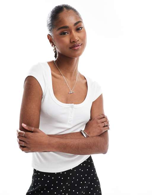 Stradivarius - T-shirt avec décolleté en cœur et boutons-pression - Blanc