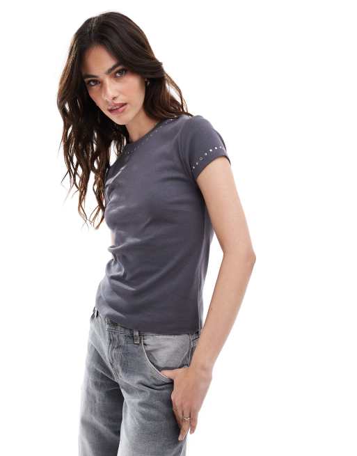 Stradivarius - T-shirt clouté - Anthracite